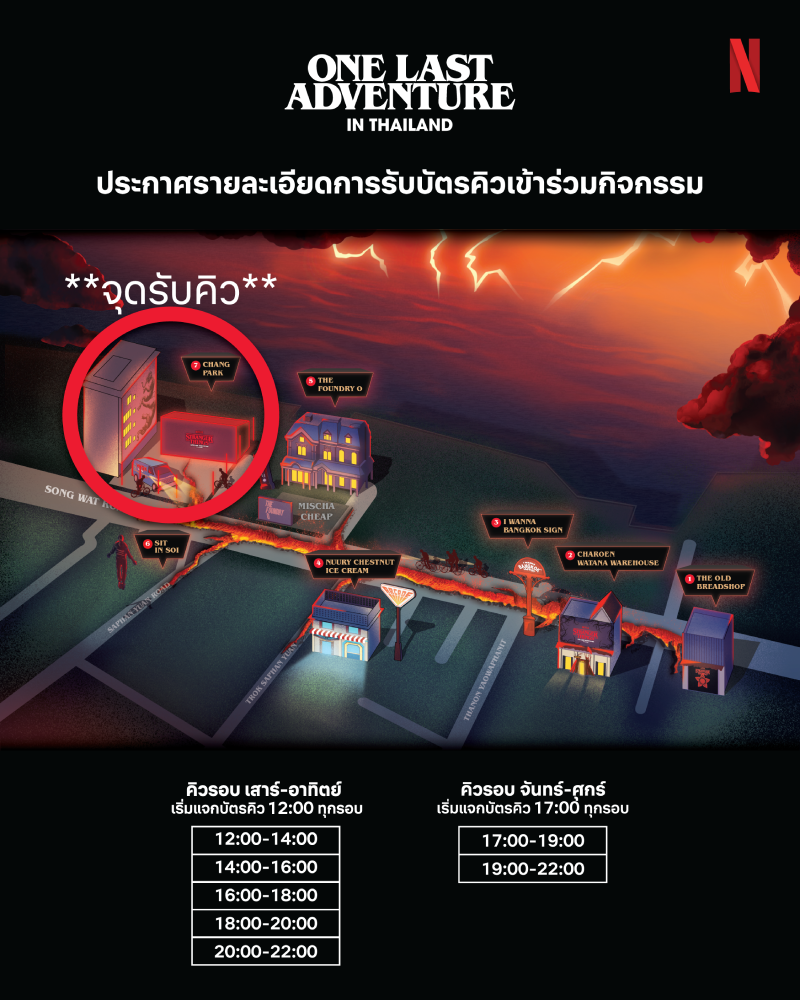 Netflix แจ้งอัปเดตถึงแฟนๆ Stranger Things ที่กำลังจะเดินทางมาร่วมสัมผัสประสบการณ์ “ONE LAST ADVENTURE IN THAILAND” ที่ถนนทรงวาด โดยขอแจ้งปรับเปลี่ยนมาตรการการเข้าร่วมกิจกรรมใหม่ เพื่ออำนวยความสะดวกให้แฟนๆ ได้รับประสบการณ์ที่ดีที่สุด ตั้งแต่วันที่ 21 – 28 ธันวาคม 2568 กิจกรรมจะมีการเปิดรับบัตรคิวเป็นรอบ ตามรายละเอียดดังนี้