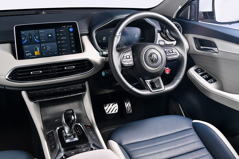 ภายในห้องโดยสารของ NEW MG HS และ NEW MG HS PHEV ตกแต่งด้วยสี 2-Tone Monaco Blue ใช้วัสดุบุนุ่มแบบ Soft Touch ให้ความรู้สึกหรูหราและพรีเมี่ยมในทุกรายละเอียด พร้อมฟังก์ชั่นที่ให้ทั้งความสะดวกสบายและคุณค่าระหว่างการขับขี่ที่ครบครัน