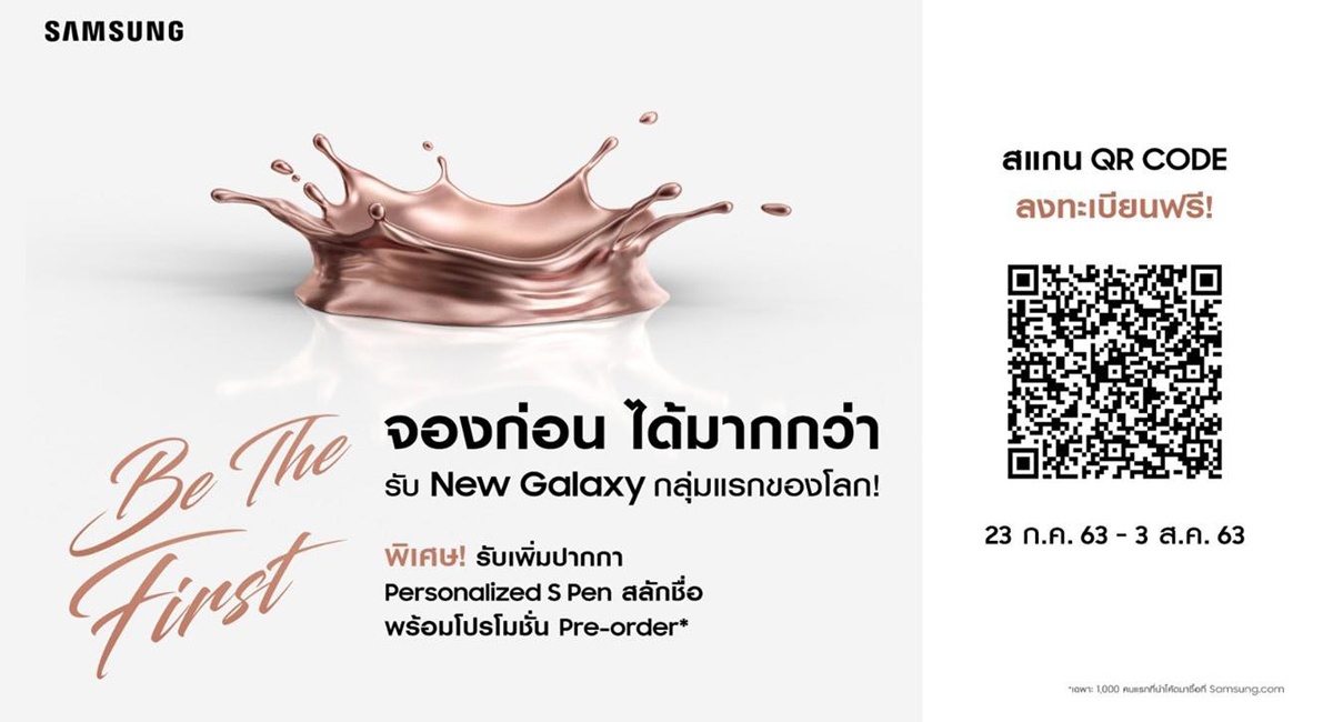 สาวกซัมซุง กาแลคซี่ โน๊ต ไม่ควรพลาด กับโค้งสุดท้ายที่จะได้เป็นเจ้าจอง “New Galaxy” กลุ่มแรกของโลก ก่อนที่จะเผยโฉมพร้อมกันครั้งแรก 5 สิงหาคม 2563 กับแคมเปญสุดพิเศษ “Be The First” พิเศษ! รับเพิ่ม ปากกา Personalized S Pen ที่สลักชื่อของคุณบน S Pen แท่งเดียวในโลกแบบสุดเอ็กซ์คลูซีฟ เพียงกรอกชื่อที่ต้องการสลักล่วงหน้าหลังจากที่ลงทะเบียนฟรีเรียบร้อยแล้ว พร้อมโปรโมชั่น Pre-order* ผู้ที่สนใจลงทะเบียนได้ฟรีเพื่อจองสิทธิ ตั้งแต่วันนี้ – 3 สิงหาคม 2563