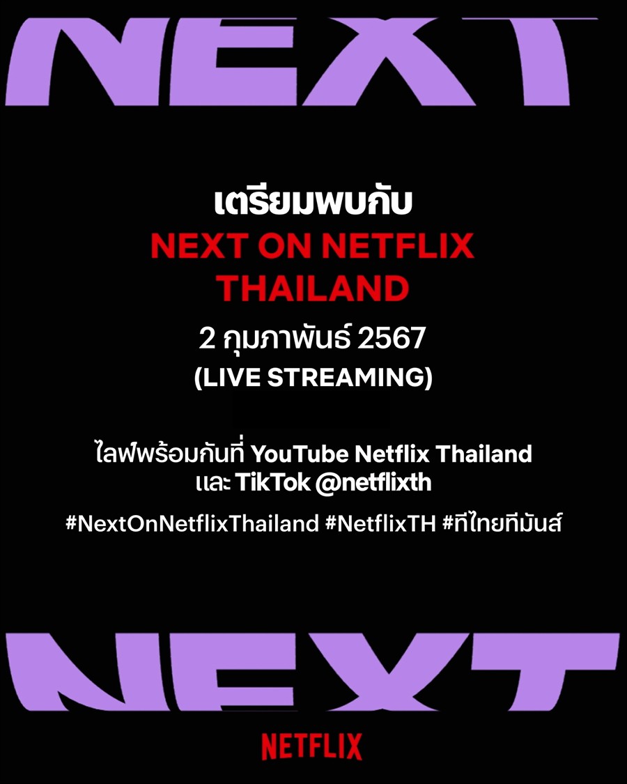 และพิเศษสุด! แฟนๆ ยังสามารถติดตามรับชมบรรยากาศพรมแดงในงาน “Next on Netflix Thailand 2024” พร้อมการประกาศไลน์อัปคอนเทนต์ปี 2024 ได้แบบเรียลไทม์ทาง YouTube และ TikTok ของ Netflix Thailand ตั้งแต่เวลา 16.00-19.30 น. เตรียมตัวให้พร้อมแล้วมาร่วมลุ้นไลน์อัปคอนเทนต์ใหม่บน Netflix ปี 2024 ที่รับรองว่าจะยิ่งใหญ่กว่าเดิม พบกันวันที่ 2 กุมภาพันธ์นี้ บอกเลยว่างานนี้ห้ามพลาด!