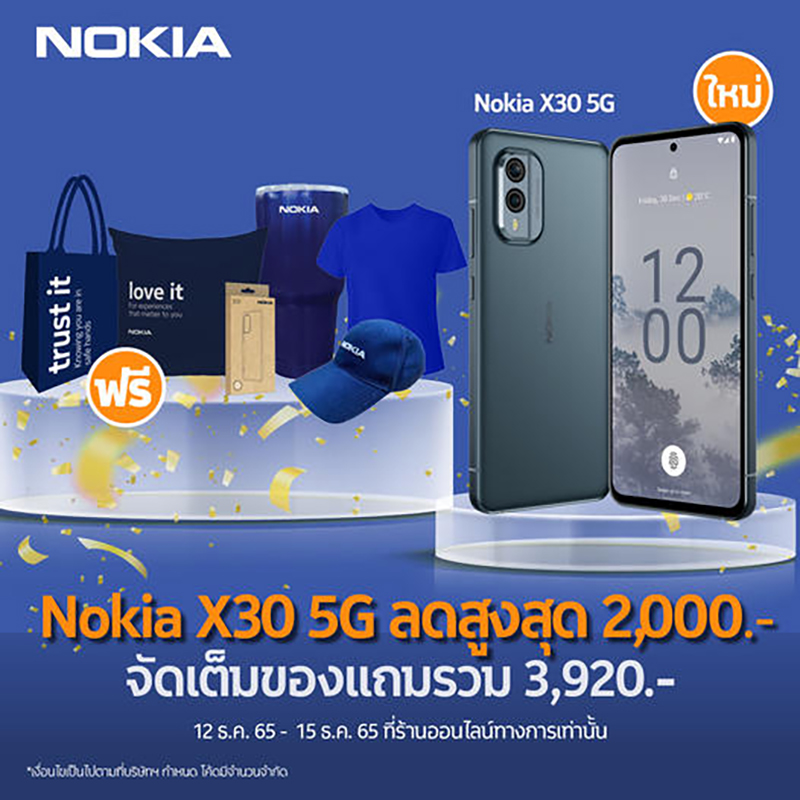 - ใหม่! Nokia X30 5G เหลือเพียง 14,990 บาท จากราคาปกติ 16,990 บาท (ส่วนลด 2,000 บาท) พร้อมรับฟรีแก้วเก็บความเย็น+เสื้อยืดแบรนด์ NOKIA+หมอนโนเกีย+หมวกโนเกีย+เคสใส+กระเป๋า+อแดปเตอร์ รวมมูลค่ากว่า 3,920 บาท