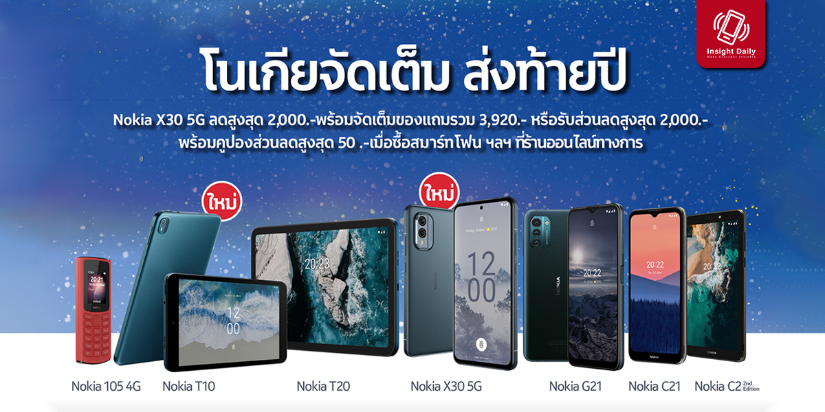 NOKIA อัดแคมเปญ 12.12 โปรฯ มอบของขวัญพิเศษ รุกหนักตลาดออนไลน์โค้งสุดท้ายของปี อยู่ที่ไหนก็ช้อปได้ 24 ชั่วโมง ลดสูงสุด 60% พร้อมผ่อน 0% สูงสุด 10 เดือน นำทัพด้วยโนเกียรักษ์โลกรุ่นล่าสุด Nokia X30 5G มาพร้อมส่วนลดสูงสุดกว่า 2,000 บาท พร้อมสมาร์ทโฟนรุ่น Nokia C2 2nd Edition, Nokia C10, Nokia C21, Nokia G20 และ Nokia G21 ฟีเจอร์โฟนรุ่น Nokia 105 4G และแท็บเล็ตรุ่นใหม่ Nokia T20 ตั้งแต่วันที่ 12 -15 ธ.ค.นี้ จัดหนักของแถมเอ็กซ์คลูซีฟจำนวนจำกัด รวมมูลค่าสูงสุดกว่า 3,920 บาท คว้าโอกาสกำลังซื้อฟื้นตัว ผู้บริโภคต้องการเปลี่ยนโทรศัพท์มือถือใหม่ หรือมอบเป็นของขวัญพิเศษส่งท้ายปี โดยเฉพาะผู้บริโภคกลุ่มครอบครัว
