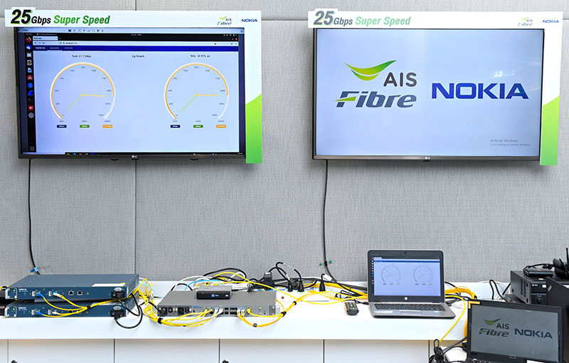 เอไอเอส ไฟเบอร์ และ โนเกีย -ร่วมมือกันทดสอบโซลูชันเครือข่ายเชิงแสงแบบพาสซีฟ 25G PON ในการทดลองใช้งานเทคโนโลยีดังกล่าวในประเทศไทยซึ่งนับว่าเป็นครั้งแรกในเอเชีย โดยใช้อุปกรณ์ส่งสัญญาณทางสายด้วยใยแก้วนำแสง (Optical Line Terminal: OLT) ที่มีการติดตั้งกระจายอยู่ทั่วประเทศแล้วในขณะนี้ โดย OLT จะถูกเชื่อมต่อไปยังอุปกรณ์แปลงสัญญาณแสงปลายทาง (Optical Network Terminal : ONT) ของผู้ใช้ทั้งสามรายในเวลาเดียวกัน ด้วยความเร็วที่รวมกันได้มากถึง 37.5 กิกะบิตต่อวินาที ด้วยการใช้ อุปกรณ์ 25G PON ONT ที่ความเร็ว 25 กิกะบิตต่อวินาที อุปกรณ์ XGS-PON ONT ที่ความเร็ว 10 กิกะบิตต่อวินาที และอุปกรณ์ G PON ONT ที่ความเร็ว 2.5 กิกะบิตต่อวินาที ซึ่งบริการทั้งหมดจะสามารถทำงานร่วมกับสายไฟเบอร์ออพติกแบบ single-mode (SM) สายเดียวได้พร้อม ๆ กัน