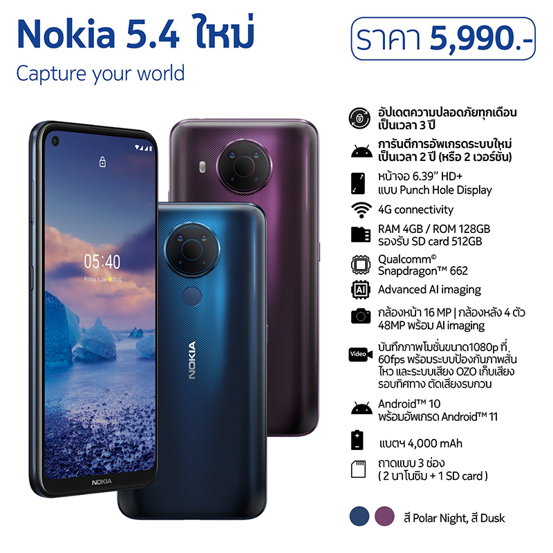 นอกจากนี้ ยังเปิดตัวโทรศัพท์สมาร์ทโฟน จำนวน 6 รุ่น ได้แก่ สมาร์ทโฟนระดับบนรุ่น “Nokia 5.4” ที่เน้นดีไซน์ให้ทันสมัย จอ IPS LCD แบบ Dot Display ขนาด 6.39 นิ้ว ขนาดกำลังดีและงานออกแบบที่สวยงาม มีให้เลือกทั้งสี Polar Night และ Dusk สเปกเต็มขุมพลัง Snapdragon 662 พร้อมRAM 4GB ความจำ 128GB สามารถเพิ่มความจำได้ในตัวและได้แบตเตอรี่อึดอยู่ได้นานสุด 2 วัน ต่อมา “Nokia G20” ที่สามารถเป็นครีเอทีฟสตูดิโอเคลื่อนที่ ด้วยกล้องถ่ายภาพคมชัด 48 ล้านพิกเซล ทั้งแบบไวด์สกรีน มาโคร และวิดีโอ รวมทั้งระบบเสียง OZO Audio เพิ่มอรรถรสให้เนื้อหา พร้อมแบตเตอรี่อึด ชาร์จเพียงครั้งเดียวใช้ได้นาน 3 วัน และสมาร์ทโฟนระดับกลางรุ่น “Nokia 3.4” จอขนาด 6.39″ HD+ แบบ Punch Hole Display พร้อมกล้องหลัง 3 ตัว 13 MP, 5 MP Ultra Wide และ 2 MP ด้วย AI อัจฉริยะ โหมดถ่ายภาพบุคคล และโหมดถ่ายภาพกลางคืน และกล้องหน้า 8 MP ที่พลาดทุกช่วงเวลาดี ๆ