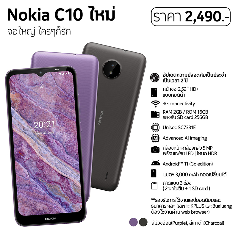 ต่อมากับ “Nokia 1.4” สเปคเกินคุ้ม ปฏิบัติการอัพเกรดได้ถึง Android 12 (Go Edition) ชิปเซ็ต Qualcomm® ประมวลผลข้อมูลแบบไม่ติดขัด พร้อมกล้องหน้าความละเอียด 5 ล้านพิกเซล กล้องคู่หลังความละเอียด 8 ล้านพิกเซล และเลนส์มาโครความละเอียด 2 ล้านพิกเซล หน้าจอ HD+ ขนาดใหญ่ 6.51 นิ้ว และแบตเตอรี่สุดอึด ใช้งานยาว ๆ 2 วัน เดินหน้าต่อด้วย “Nokia C10” โดดเด่นที่ความลงตัวระหว่างแบตเตอรี่เพียงพอสำหรับใช้งานเต็มวัน และหน้าจอ HD+ ระดับคริสตัลเคลียร์ที่ใหญ่คมชัด ฟีเจอร์วิดีโอ HDR คู่กับแฟลช LED ด้านหน้าและด้านหลัง ยกระดับการถ่ายภาพที่เหนือชั้น และ “Nokia G10” ที่พร้อมตอบโจทย์ทุกการใช้งาน โดดเด่นดีไซน์ตัวเครื่องสีม่วง (Dusk) นำเทรนด์ พร้อมด้วยสีน้ำเงิน (Night) ในราคาที่จับต้องได้เพียง 3,990 บาท ด้วย CPU Mediatek G25 8x A53 2.0GHz และจอขนาดใหญ่ 6.5 นิ้ว คมชัดระดับ HD+ สเปกเดียวกับ Nokia G20 โดยแต่ละรุ่นล้วนมีจุดเด่น เน้นเอกลักษณ์เฉพาะแบรนด์ โนเกีย ที่ดีไซน์สวย ฟังก์ชันครบ วัสดุคงทน คุ้มเกินราคา พร้อมแบตเตอรี่สุดอึด แถมอัพเดทระบบปฏิบัติการและระบบความปลอดภัยต่อเนื่องนาน 2 ปี
