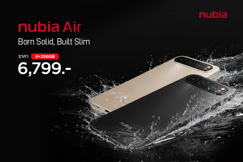nubia Air วางจำหน่ายในไทย 2 สีสุดพรีเมียม ได้แก่ Titanium Black และ Titanium Desert ในราคา 6,799 บาท สามารถสั่งซื้อได้แล้ววันนี้ ผ่านช่องทางออนไลน์ Lazada, Shopee, Tiktok Shop และหน้าร้าน BaNANA ทุกสาขา