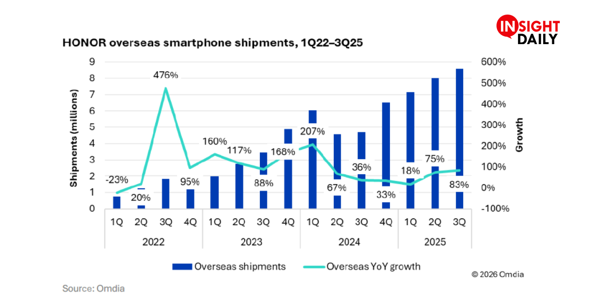HONOR ยกระดับการดำเนินธุรกิจในตลาดโลก สู่การเป็นเสาหลักสำคัญในการสร้างการเติบโตอย่างเต็มตัว โดยได้รับแรงหนุนจากยอดจัดส่งสมาร์ทโฟนที่เพิ่มขึ้นอย่างแข็งแกร่ง พร้อมการปรับพอร์ตโฟลิโอที่มุ่งเน้นผลิตภัณฑ์ระดับกลางถึงไฮเอนด์ (Mid-to-High-end) และการวางกลยุทธ์จำแนกตามพื้นที่ ทั้งในตลาดยุโรป, ละตินอเมริกา, ตะวันออกกลาง และแอฟริกา รวมถึงเอเชียตะวันออกเฉียงใต้ อย่างไรก็ตาม ความท้าทายสำคัญในการรักษาความต่อเนื่องของแรงส่งนี้ ขึ้นอยู่กับความสามารถในการบริหารจัดการความเสี่ยงด้านซัพพลายเชน การยกระดับการดำเนินงานในระดับท้องถิ่นให้ลึกซึ้งยิ่งขึ้น รวมถึงการต่อยอดสร้างรายได้จากบริการที่ขับเคลื่อนด้วยนวัตกรรม AI นอกเหนือจากการจำหน่ายฮาร์ดแวร์เพียงอย่างเดียว