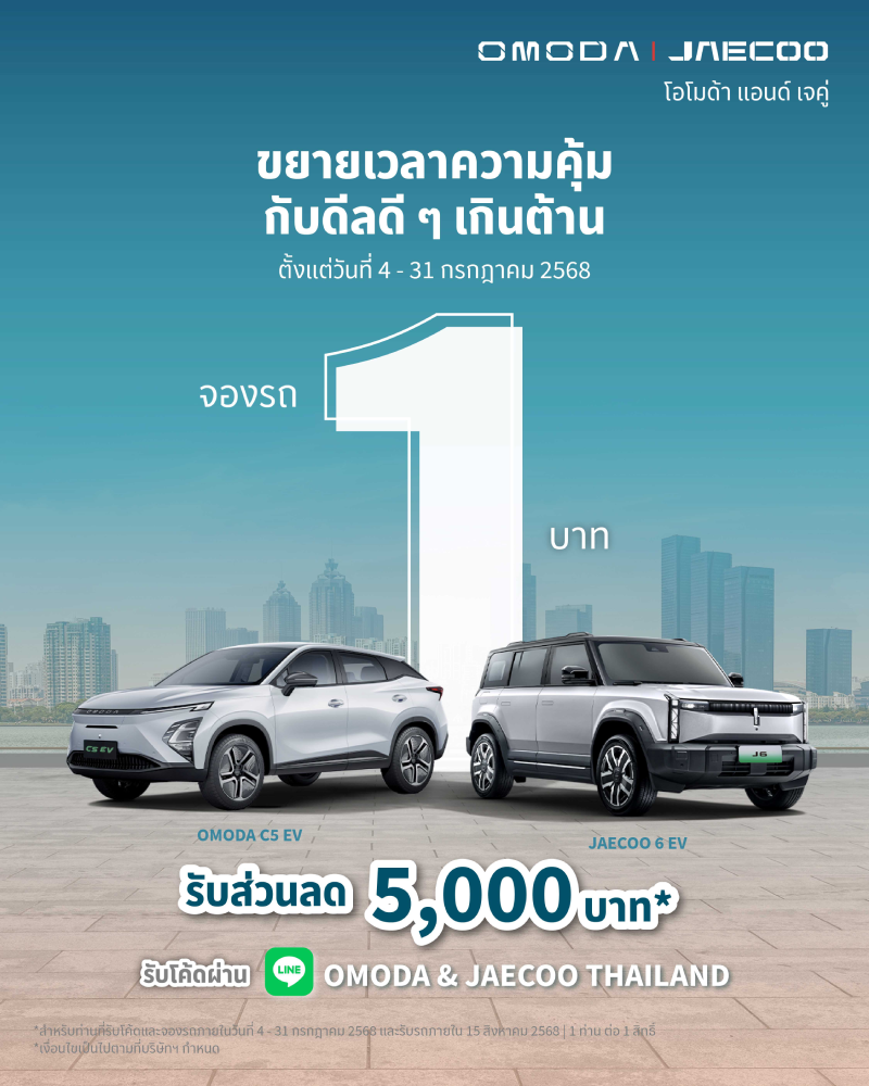 ขยายเวลาพิเศษสำหรับลูกค้าที่จองรถ OMODA C5 EV และ JAECOO 6 EV ผ่านทาง Line Official Account ของ OMODA & JAECOO ในช่วงวันที่ 4 – 31 กรกฎาคม 2568 รับโคดพิเศษเพื่อนำไปยื่นที่ผู้จำหน่ายทั่วประเทศ เพียงจ่ายเงินจอง 1 บาท รับส่วนลดมูลค่า 5,000 บาท เมื่อออกรถ โดยส่งมอบรถภายในวันที่ 15 สิงหาคม 2568