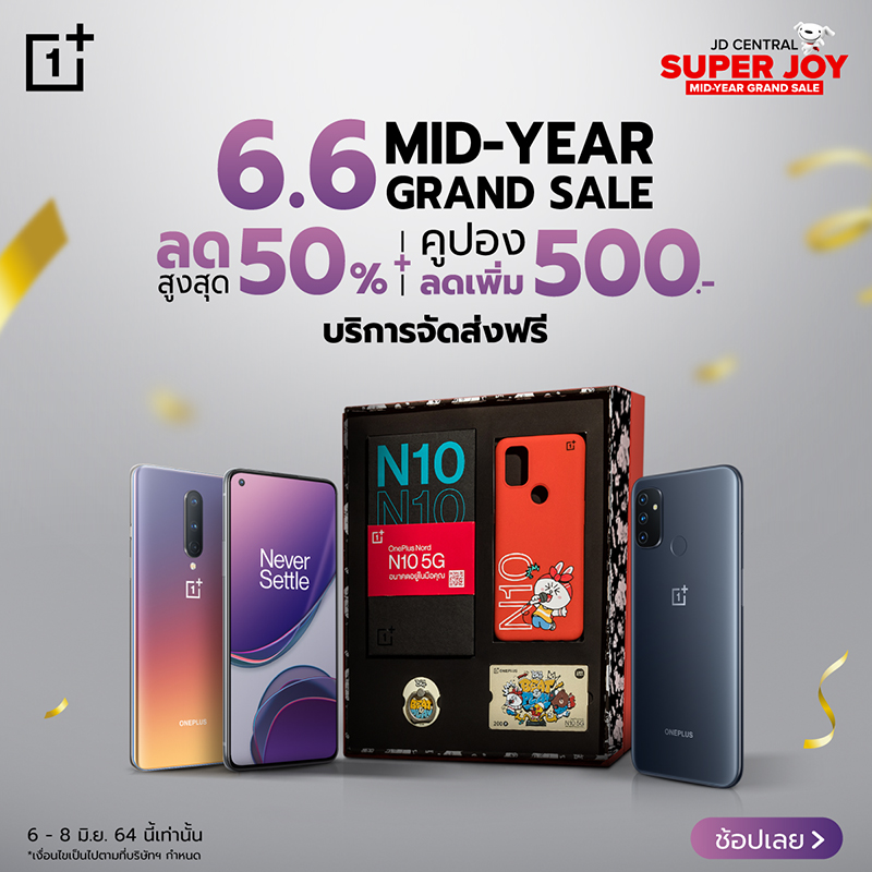 ต้อนรับเทศกาล 6.6 Mid-Year Sale กลางปี OnePlus แบรนด์สมาร์ทโฟนระดับเรือธงขนทัพโปรโมชันมากมายกับสมาร์ทโฟน หูฟัง และอุปกรณ์เสริม ลดสูงสุด 50% พร้อมคูปองส่วนลดเพิ่ม 500 บาท พิเศษ! ส่งฟรีทุกรายการทั้งสามช่องทางการจำหน่ายออนไลน์ Shopee, Lazada และ JD Central พิเศษกว่าทุกทีเพราะส่งฟรีทุกไอเท็ม! และยังมีของรางวัลแจกอีกเพียบ ช้อปโปรโมชั่นสุดคุ้ม OnePlus 6.6 ผ่านช่องทางออนไลน์ได้ที่