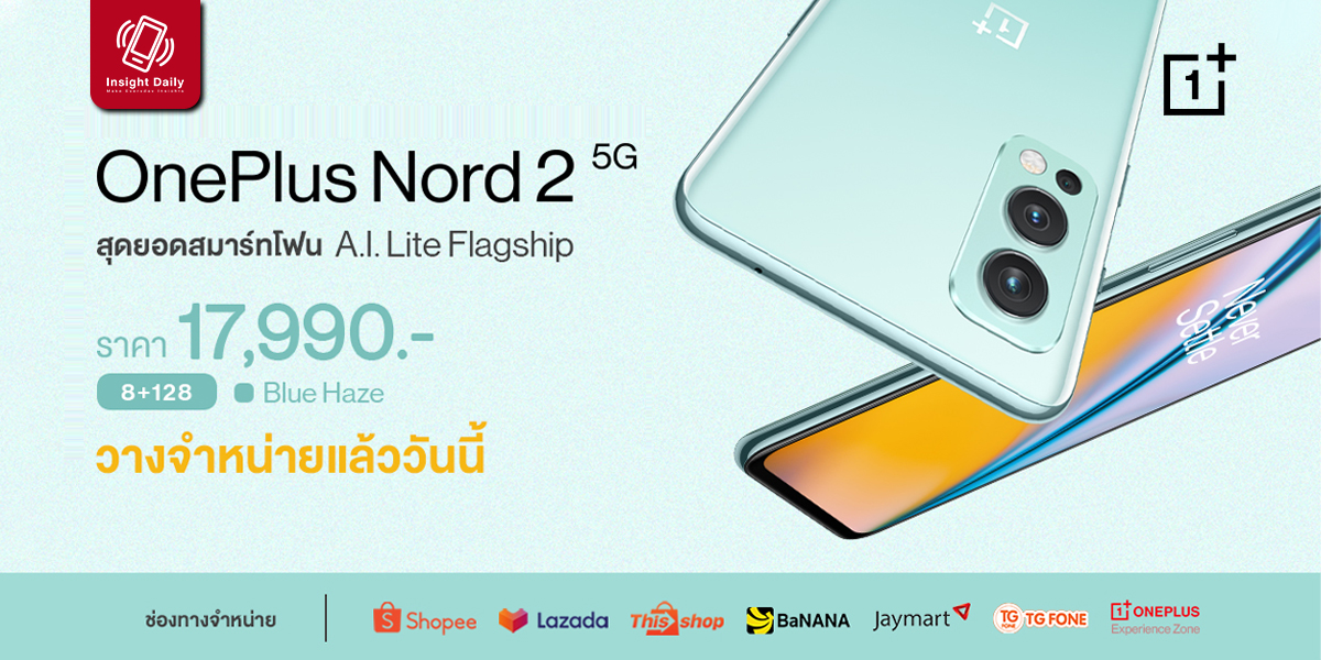วันพลัส (OnePlus) ประเทศไทย เปิดตัว OnePlus Nord 2 5G สุดยอดสมาร์ทโฟน A.I. Lite Flagship ด้วยเทคโนโลยี A.I. สุดล้ำ สีใหม่ Blue Haze สีฟ้าสดใส ที่มาในรุ่น RAM 8GB + ROM 128GB คุ้มค่าในราคา 17,990 บาท ชูจุดเด่นด้วยชิปเซ็ต MediaTek Dimensity 1200-AI เน้นย้ำความสามารถของ A.I. ที่อัพเกรดทั้งการเล่นเกม A.I. Enhanced Gameplay, การถ่ายภาพด้วย A.I. Camera กล้องหลักคมชัด 50 MP ระบบกันสั่น OIS และเซ็นเซอร์ Sony IMX766, และ A.I. Optimized Display การแสดงผลบนหน้าจอที่มาพร้อมคุณสมบัติใหม่ อย่าง A.I. Color Boost และ A.I. Resolution Boost ยกระดับความละเอียดของภาพและสีให้ชัดเจนสมจริงยิ่งขึ้น, แบตเตอรี่ที่อึดถึง 4,500 mAh และ Warp Charge 65W รองรับ 5G ร่วมกับระบบปฏิบัติการ OxygenOS 11.3 ที่เร็วและตอบสนองไวที่สุดของ OnePlus พร้อมวัสดุสุดพรีเมียมให้คุณตกหลุมรักตั้งแต่สัมผัสแรก
