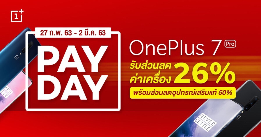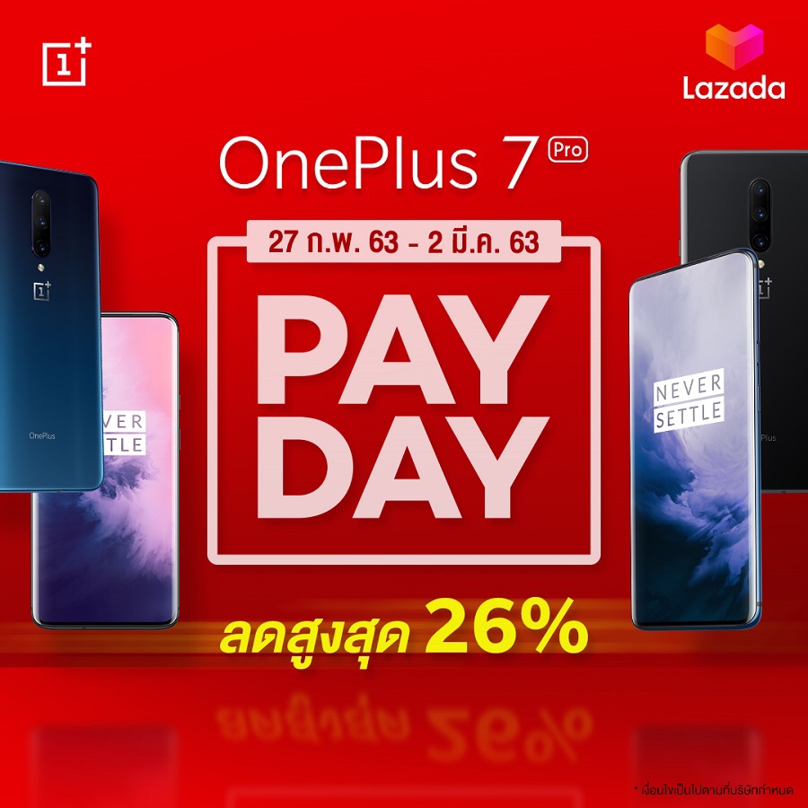 แคมเปญ Pay Day เมื่อสั่งซื้อ OnePlus 7 Pro รับส่วนลดค่าเครื่องสูงสุด 26% เริ่มต้น 14,999 บาท ผ่านช่องทาง Lazada >>> bit.ly/2Sj74tP ตั้งแต่ 27 กุมภาพันธ์ – 2 มีนาคม 2563