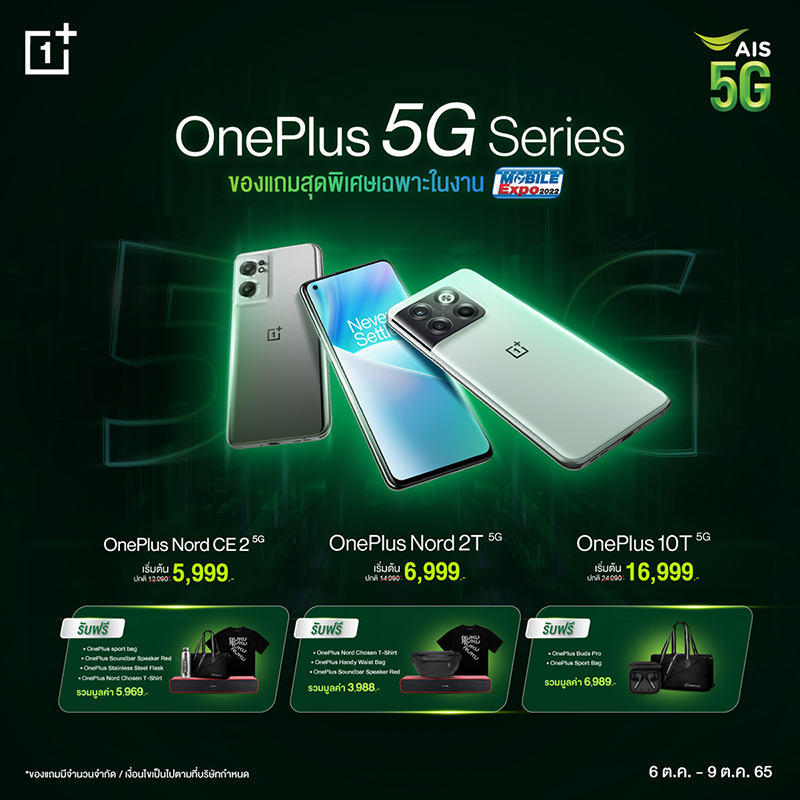 ภายในงานครั้งนี้ ทาง OnePlus ร่วมกับ AIS ได้นำ OnePlus 10T 5G, OnePlus Nord 2T 5G และ OnePlus Nord CE 2 5G มาพร้อมโปรโมชั่นเด็ด สุดคุ้ม เมื่อซื้อเครื่องพร้อมแพ็กเกจสำหรับงานในครั้งนี้โดยเฉพาะ ที่บูธ AIS เท่านั้น!