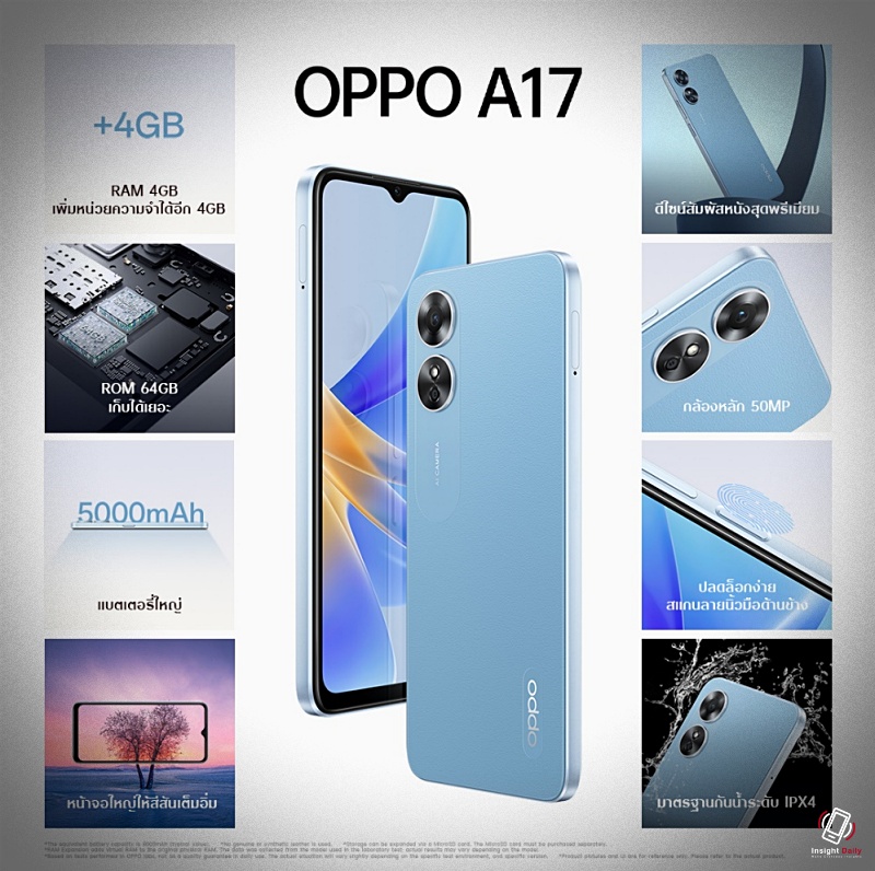 OPPO A17 สมาร์ตโฟนที่มาพร้อมความคุ้มค่ายิ่งกว่า จัดเต็มด้วยหน่วยความจำ RAM 4GB + ROM 64GB เพิ่ม RAM ได้อีก 4GB มอบการทำงานที่มีประสิทธิภาพและทรงพลัง พร้อมใช้งานได้ตลอดวันด้วยแบตเตอรี่ขนาดใหญ่ 5,000mAh และตอบโจทย์การใช้งานความบันเทิงด้วยหน้าจอขนาดใหญ่ 6.59 นิ้ว HD+ มอบสีสันเต็มอิ่มพร้อมจอถนอมสายตาให้คุณเต็มที่ได้กับทุกความบันเทิง พร้อมโดดเด่นด้วยดีไซน์สัมผัสหนังสุดพรีเมียม สะกดทุกสายตา