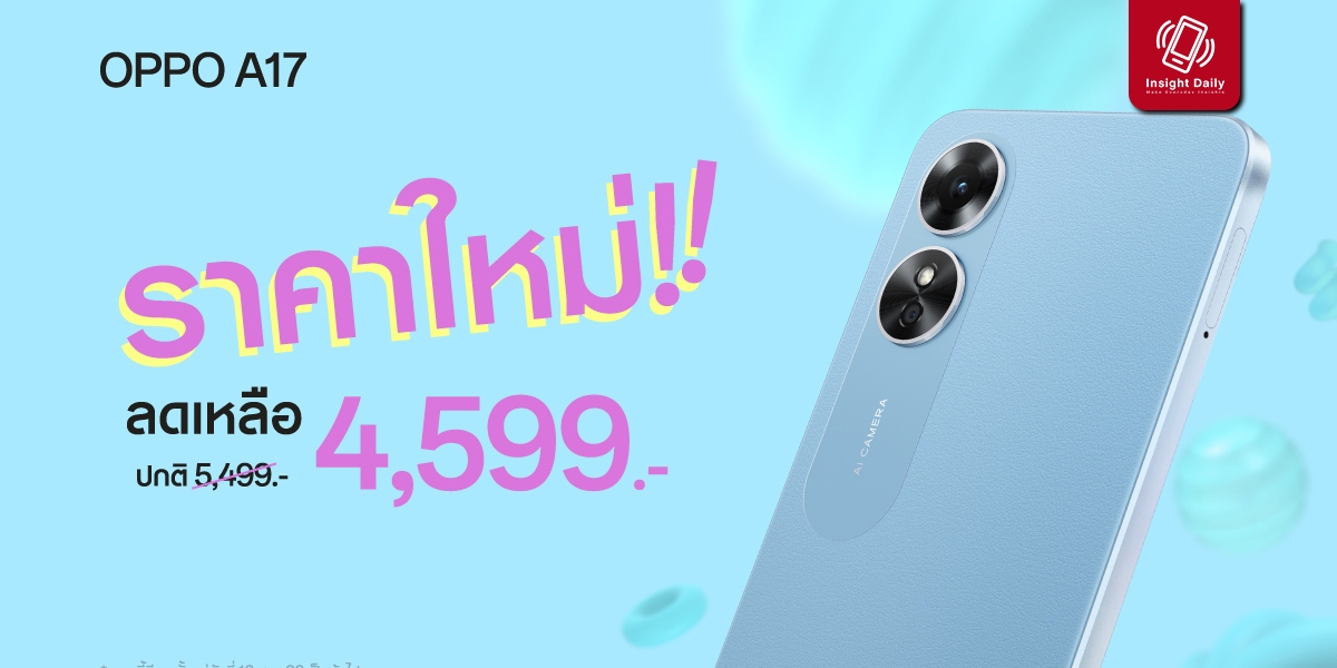 OPPO A17 สมาร์ตโฟนน้องเล็กพร้อมมอบประสบการณ์ใช้งานที่คุ้มค่ากว่าและราคาโดนใจยิ่งขึ้น ด้วยราคาใหม่สุดพิเศษ 4,599 บาท จากราคาปกติ 5,499 บาท ตั้งแต่วันที่ 18 สิงหาคม 2566 เป็นต้นไป