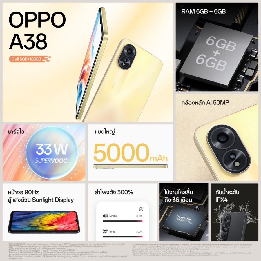 OPPO A38 รุ่น 6GB+128GB สวยโดดเด่นด้วยดีไซน์ OPPO Glow มาใน 2 สีให้เลือก ได้แก่ สีทอง Glowing Gold และสีดำ Glowing Black วางจำหน่ายในราคา 4,999 บาท สามารถไปทดลองสัมผัสหรือเป็นเจ้าของได้แล้ววันนี้ ณ OPPO Brand Shop ทุกสาขาและตัวแทนจำหน่ายทั่วประเทศ