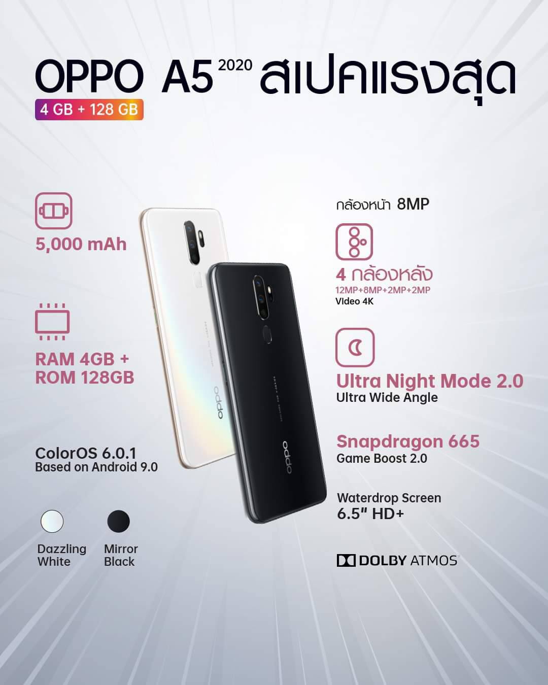 OPPO A5 2020 4GB วางจำหน่าย 2 สี คือ สีดำ Mirror Black และสีขาว Dazzling White ในราคาใหม่เพียง 6,299 บาท โดยปรับราคาใหม่ตั้งแต่วันที่ 3 มกราคม 2563 เป็นต้นไป