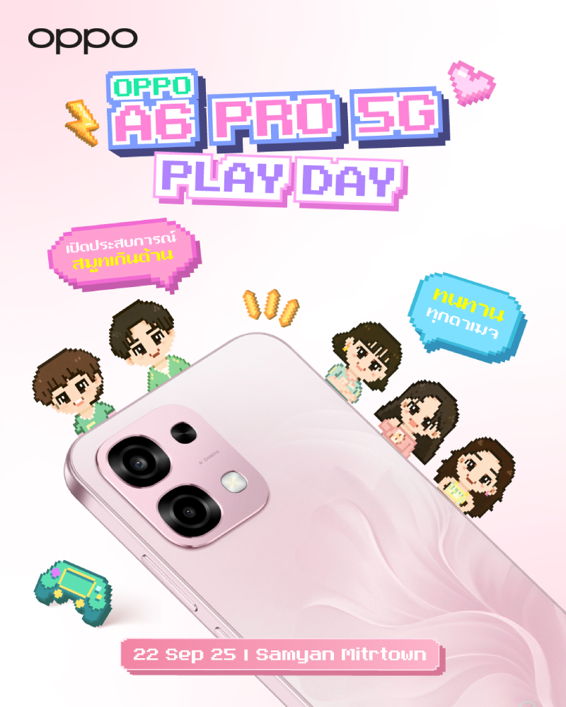เตรียมพบกับงาน “OPPO A6 Pro 5G Play Day เปิดประสบการณ์สมูทเกินต้าน ทนทานทุกดาเมจ” พร้อมร่วมสนุกไปกับมินิคอนเสิร์ตสุดพิเศษจากสาวๆ วง PiXXiE ที่จะมาสร้างสีสันและความสนุกแบบจัดเต็ม! พร้อมร่วมเล่นเกมสุดท้าทายกับสองนักแสดงหนุ่ม โทมัส – ก้อง ที่จะมาดวลความมันส์ เพื่อพิสูจน์ความลื่นไหลของสมาร์ตโฟน OPPO A6 Pro 5G ในวันที่ 22 กันยายน 2568 นี้ เท่านั้น