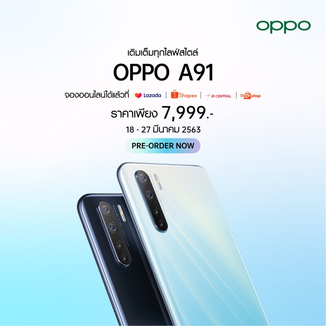 OPPO A91 สมาร์ทโฟนดีไซน์บางเฉียบ พร้อม 4 กล้องหลัง “เติมเต็มทุกไลฟ์สไตล์” พรีออเดอร์ได้แล้ววันนี้! ในราคา 7,999 บาท