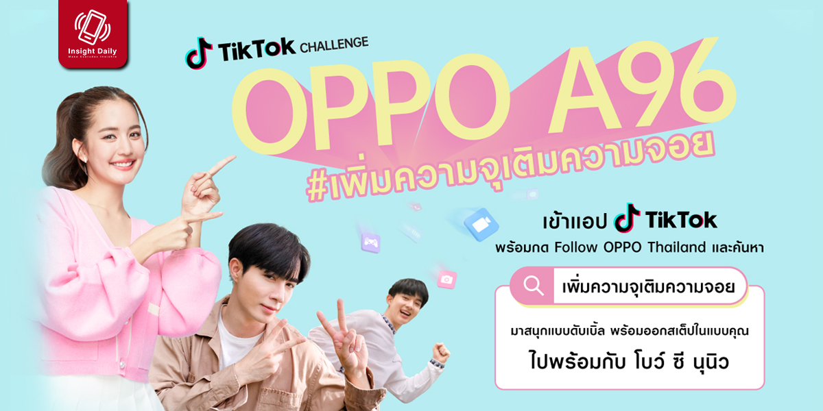 ออปโป้ ชวนชาว TikTok มาออกสเต็ปพร้อมกันกับ พรีเซนเตอร์สาวสวย “โบว์ เมลดา” ที่แท็กทีมคู่จิ้นสุดซี้ “ซี พฤกษ์ – นุนิว ชวรินทร์” มาร่วมเก็บความน่ารักแบบจอยๆ ไปกับชาเลนจ์ #เพิ่มความจุเติมความจอย แล้วลุ้นรับ “OPPO A96” รุ่นใหม่ (มูลค่า 9,999 บาท) จำนวน 2 รางวัล และ OPPO Enco Air2 จำนวน 3 รางวัล รวมมูลค่า 25,995 บาท!