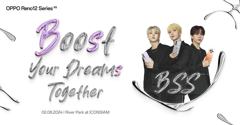 หลังจากการเปิดตัวของ “OPPO Reno12 Series 5G” รุ่นใหม่ล่าสุดที่ถือเป็น AI Phone เครื่องแรกจากออปโป้ที่ดีที่สุดสำหรับคนรุ่นใหม่ก็ได้รับกระแสตอบรับที่ดีเกินคาดจากผู้บริโภคทั่วประเทศ และเพื่อขอบคุณการตอบรับจากแฟนๆ ออปโป้เตรียมเนรมิตจักรวาลสีเงินสุดอลังการ พร้อมมอบพลังแห่งความฝันและต่อยอดความคิดสร้างสรรค์อย่างไร้ขีดจำกัด เมื่อสุดยอดเทคโนโลยีผสานกับความบันเทิงอย่างเต็มพิกัด จึงเกิดเป็นกิจกรรมสุดยิ่งใหญ่แห่งปี “Boost Your Dreams Together” ที่นอกจากจะมีกิจกรรมให้ร่วมสนุกมากมายแล้ว ยังพร้อมมอบความพิเศษเหนือใครกับเซอร์ไพรส์แบบคูณ 3 กับ 3 ศิลปินเกาหลี “BSS” (SEVENTEEN) นำโดย SEUNGKWAN, DK และ HOSHI ที่ทุกคนตั้งตารอ