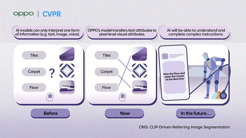 เทคโนโลยี Cross-modal ถูกมองว่าเป็นกุญแจสำคัญในการสร้างปัญญาประดิษฐ์ ‘ให้มีความเป็นมนุษย์” ข้อมูลที่แตกต่างกันมีลักษณะที่แตกต่างกัน ข้อมูลข้อความมักมีรายละเอียดกว้างๆ ในขณะที่ข้อมูลภาพจะมีรายละเอียดตามบริบทเฉพาะจำนวนมาก การสร้างการโต้ตอบที่มีประสิทธิภาพสำหรับข้อมูลหลายรูปแบบจึงถือเป็นความท้าทายอย่างยิ่ง นักวิจัยของ OPPO ได้เสนอเฟรมเวิร์ก CRIS ใหม่โดยใช้โมเดล CLIP เพื่อให้ AI สามารถเข้าใจข้อความและข้อมูลภาพได้ละเอียดยิ่งขึ้น โดยโมเดลนี้สามารถจับคู่การรับรู้ทางการมองเห็นที่เกี่ยวข้องกับรูปภาพได้อย่างแม่นยำหลังจากป้อนคำอธิบายข้อความที่มีความซับซ้อนเข้าไป