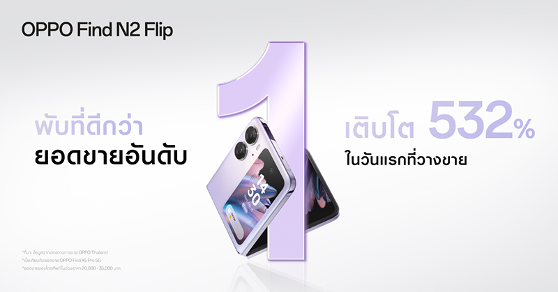 วางจำหน่ายแล้ววันนี้ “OPPO Find N2 Flip” สมาร์ตโฟนที่พร้อมมอบประสบการณ์พับที่ดีกว่า กระแสแรง ผลตอบรับถล่มทลาย กวาดยอดขายเป็นอันดับ 1 ตั้งแต่วันแรกที่เริ่มวางจำหน่าย เป็นสมาร์ตโฟนจอพับที่มาแรงที่สุดในเวลานี้ ในตลาดสมาร์ตโฟนช่วงราคา 20,000 – 35,000 บาท กวาดยอดขายกว่าพุ่งสูงกว่า 532% ตั้งแต่วันแรกที่วางขายเมื่อเทียบกับรุ่นก่อน พร้อมวางจำหน่ายอย่างเป็นทางการแล้ววันนี้ในราคา 29,990 บาท ที่ OPPO Brand Shop ทุกสาขาและตัวแทนจำหน่ายทั่วประเทศ
