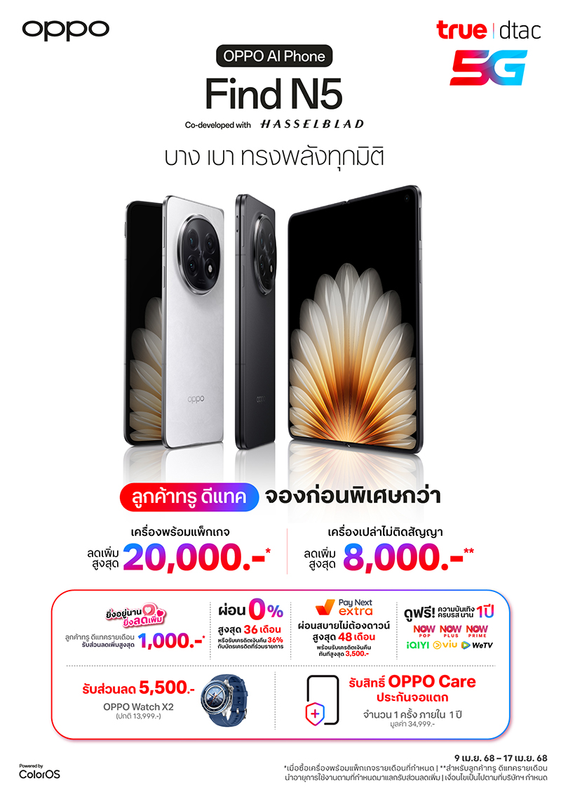 โดย OPPO Find N5 สมาร์ตโฟนจอพับที่บางที่สุด ยกระดับความทรงพลังในทุกมิติ มาพร้อมกับราคาสุดพิเศษจากทรู ดีแทค พิเศษเฉพาะสั่งจองล่วงหน้า ราคาเครื่องพร้อมแพ็กเกจรายเดือน ลดสูงสุด 20,000 บาท ลูกค้าทรู ดีแทค นำอายุการใช้งานแลกรับส่วนลดเพิ่มสูงสุด 1,000 บาท พร้อมรับสิทธิ์ ดูฟรี! ความบันเทิงครบรสระดับพรีเมียมแบบจัดเต็ม นาน 1 ปี กับ True VISION NOW POP / NOW PLUS / NOW PRIME อีกทั้ง ละคร ซีรีส์ วาไรตี้ ซิทคอม อาทิเช่น iQIYI, viu , we TV และพิเศษสั่งจองเครื่องเปล่าล่วงหน้า ลูกค้าทรู ดีแทคนำอายุการใช้งานแลกรับส่วนลดเครื่องเปล่าลดสูงสุด 8,000 บาท