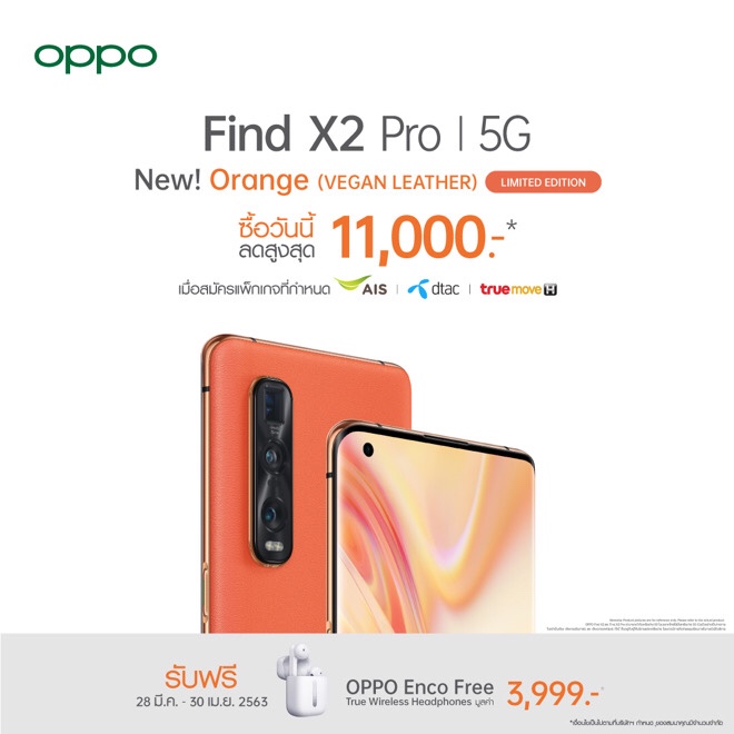 หรือสามารถซื้อผ่านผู้ให้บริการเครือข่ายทั่วประเทศ ลดสูงสุด 11,000 บาท วันนี้ – 30 เมษายน 2563 พิเศษสำหรับ OPPO Find X2 Pro 5G ทั้งสี Orange (Vegan Leather) Limited Edition และ สี Black (Ceramic) รับฟรี OPPO Enco Free True Wireless Headphones มูลค่า 3,999 บาท