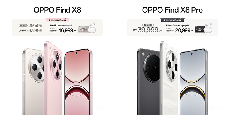 สำหรับ OPPO Find X8 มาด้วยกันทั้งหมด 3 สี ได้แก่ สีเทา Star Grey, สีชมพู Shell Pink และสีดำ Space Black มีให้เลือก 2 รุ่นความจุ ได้แก่ RAM 12GB + ROM 256GB ราคา 29,999 บาท และ RAM 16GB + ROM 512GB ราคา 33,999 บาท