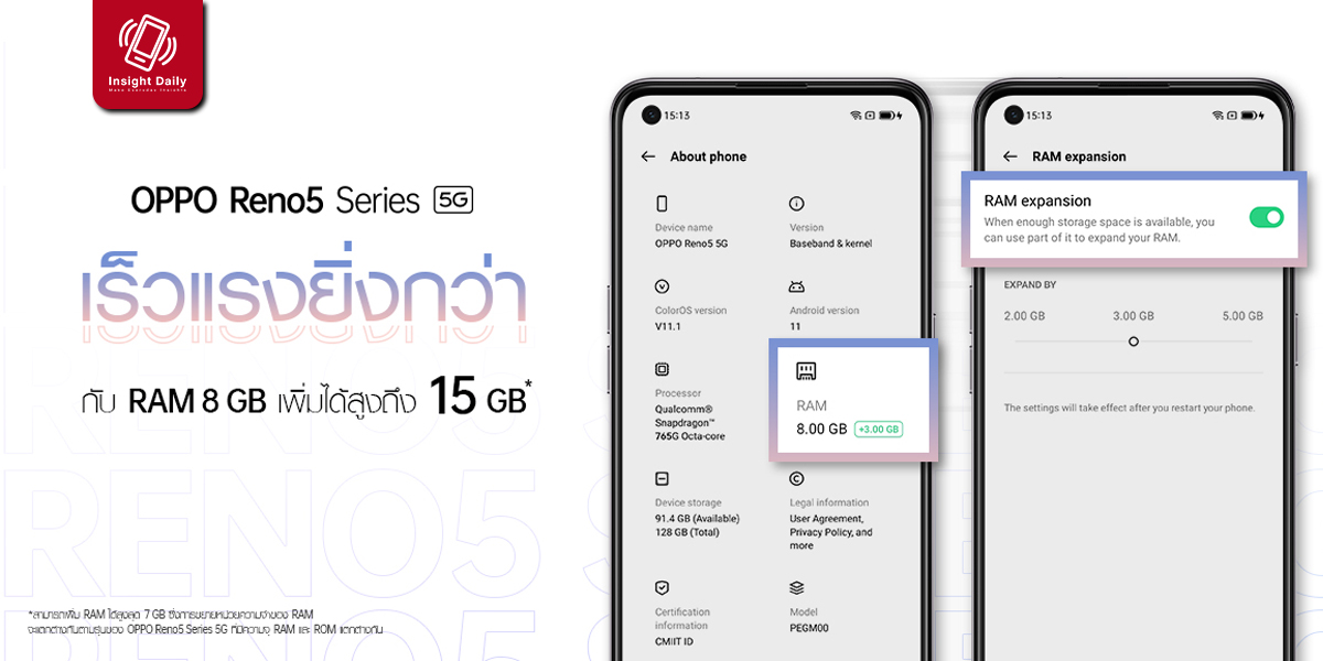 - ผู้ใช้ OPPO Reno5 Series 5G สามารถเพลิดเพลินไปกับประสิทธิภาพที่เพิ่มขึ้นและการใช้งานที่ราบรื่นยิ่งขึ้นจากการขยาย RAM