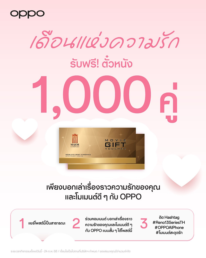 และจัดเต็มของขวัญสุดพิเศษรับเทศกาลวาเลนไทน์ เพียงแค่ร่วมคอมเมนต์เรื่องราวความรักของคุณกับ OPPO ในโพสต์ ลุ้นรับ! ตั๋วหนังจำนวน 1,000 รางวัล (จำกัดจำนวนรางวัลละ 2 ใบ) ที่ช่องทาง Facebook OPPO Official