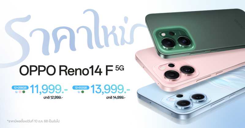 OPPO Reno14 F 5G สมาร์ตโฟนที่อัปเกรดประสบการณ์ The AI Portrait Expert ถ่ายพอร์ตเทรตสวยด้วยการอัปเกรดไปอีกขั้น พร้อมมอบประสบการณ์ใช้งานที่คุ้มในราคาที่คุ้มค่ายิ่งขึ้น OPPO Reno14 F 5G (12GB + 256GB) มาในราคาใหม่สุดพิเศษ 11,999 บาท จากราคาปกติ 12,999 บาท และพิเศษยิ่งกว่านั้น OPPO Reno14 F 5G (12GB + 512GB) มาในราคาใหม่ 13,999 บาท จากราคาปกติ 14,999 บาท ตั้งแต่วันที่ 10 ตุลาคม 2568 เป็นต้นไป