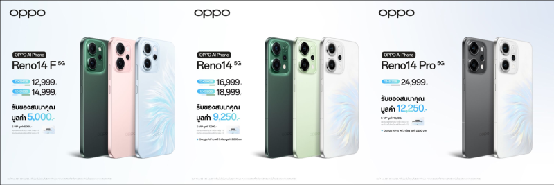- สำหรับลูกค้าที่ซื้อ OPPO Reno14 Pro 5G จะได้รับของสมนาคุณมูลค่าสูงสุด 12,250 บาท E-VIP ประกันจอแตกจำนวน 1 ครั้ง ภายในระยะเวลา 1 ปีและประกันในพื้นที่เอเชีย-แปชิฟิก (นับจากวันที่ซื้อเครื่อง ผลบังคับใช้ 1 ปี) มูลค่า 10,000 บาท และสิทธิ์ Google AI Pro ฟรี 3 เดือน มูลค่า 2,250 บาท