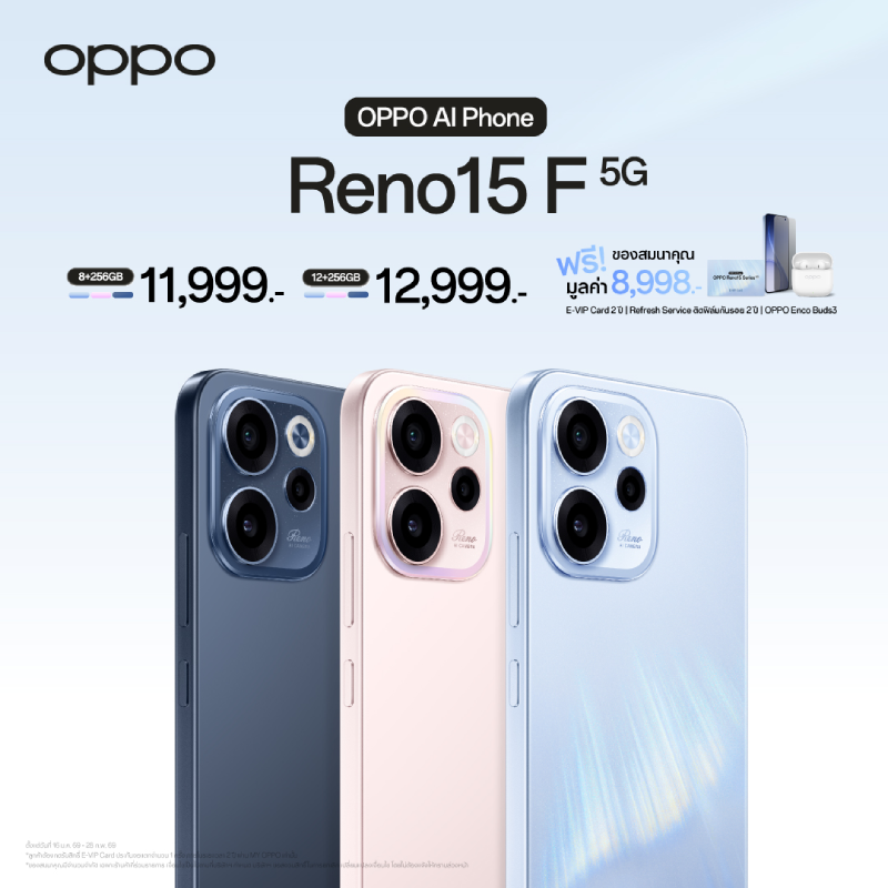 OPPO ประกาศวางจำหน่าย OPPO Reno15 Series 5G สมาร์ตโฟนเพื่อนซี้ เทรนดี้ทุกช็อต รุ่นใหม่ล่าสุด วางจำหน่ายในราคาสุดคุ้ม เริ่มต้นเพียง 11,999 บาท มาพร้อมโปรโมชั่นสุดพิเศษ วันนี้ – 28 กุมภาพันธ์ 2569 อีกทั้งยังมอบทุกประสบการณ์การใช้งานด้วย 2 ผลิตภัณฑ์ IoT ใหม่ อย่าง OPPO Watch S วางจำหน่ายในราคาเริ่มต้น 5,999 บาท และ OPPO Pad 5 ในราคาเริ่มต้น 13,999 บาท