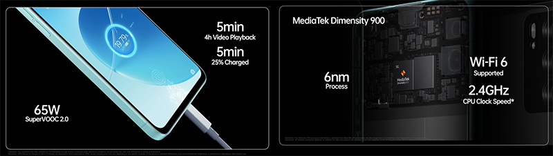 หมดกังวลเรื่องการใช้งานตลอดวัน ไม่ว่าจะเล่นเกมหรือเล่นโซเชียล เพราะ OPPO Reno6 5G มาพร้อมแบตเตอรี่ขนาด 4300mAh และเทคโนโลยีชาร์จเร็ว 65W SuperVOOC 2.0 ทำให้สามารถชาร์จแบตได้เต็ม 100% ภายใน 28 นาที และเพียงชาร์จแค่ 5 นาที ก็สามารถดูวิดีโอได้นานถึง 4 ชั่วโมง พร้อมให้ลุยทุกคอนเทนท์บนโลกออนไลน์ด้วยขุมพลังสุดแรง MediaTek Dimensity 900 Integrated 5G SoC ที่รองรับการเชื่อมต่อ 5G นอกจากนี้ด้วย RAM 8GM, ROM 128GB ที่มาพร้อมเทคโนโลยี RAM Expansion ช่วยแก้ปัญหาเมื่อโทรศัพท์กำลังขาด RAM ในการใช้งานเมื่อเปิดหลายแอปฯ พร้อมกัน โดยเลือกแปลงส่วนหนึ่งของ ROM ที่มีอยู่มาเป็นหน่วยความจำเสมือนแบบอัตโนมัติเพื่อประสบการณ์การใช้งานที่ลื่นไหลที่สุด