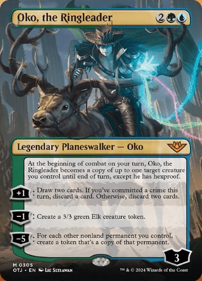 สุดท้าย เราคงไม่กล่าวถึงกรอบ Wanted Poster ซึ่งประกาศการล่าค่าหัวของเหล่าวายร้ายไปไม่ได้ การ์ดรูปแบบนี้ ถูกสงวนไว้ให้สมาชิกแก๊งโจรของ Oko อย่าง Vraska, Kellan, Annie Flash, Rakdos และ Tinybones โดยเฉพาะ ซึ่งกรอบนี้สามารถหาได้ในทั้ง Play และ Collector Booster