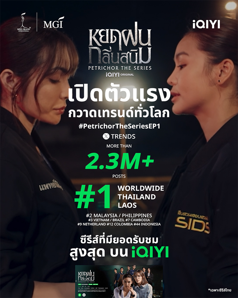 เรียกว่าไม่ทำผิดให้แฟน ๆ ผิดหวัง ยิ่งใหญ่สมการรอคอยกับ iQIYI Original “หยดฝนกลิ่นสนิม (Petrichor)” ซีรีส์ Girls’ Love เรื่องแรก ที่นำแสดงด้วยทัพนักแสดงคุณภาพของประเทศ ไม่ว่าจะเป็น อิงฟ้า วราหะ, ชาล็อต ออสติน, มีนา ริณา, หลิน มาลิน, ณ ณภัทร, แมกซ์ ณัฐพล, แปลน รัฐวิทย์, ป่าน คมกฤษณ์ และ ณฉัตร กวิยณัฎฐ์ ที่เปิดตัวตอนแรกสุดร้อนแรงจนส่งผลให้ #PetrichorTheSeriesEP1 สร้างปรากฏการณ์ครองเทรนด์ X ทั่วโลก กับอันดับ 1 Worldwide / Thailand / Laos อันดับ 2 Malaysia / Philippines อันดับ 3 Vietnam / Brazil อันดับ 7 Cambodia อันดับ 9 Netherlands อันดับ 12 Columbia และอันดับ 44 Indonesia อีกทั้งยังพุ่งทะยานสู่ซีรีส์ไทยที่มียอดรับชมสูงสุดอันดับ 1 บนแอป iQIYI (อ้ายฉีอี้) อีกด้วย