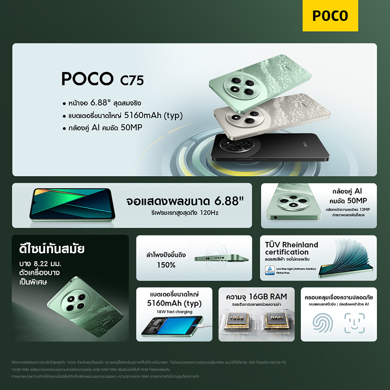 POCO C75 วางจำหน่ายแล้ว! ชูจุดเด่นหน้าจอสมจริง 6.88″ และแบตเตอรี่ใหญ่ 5160mAh (typ) ราคาเริ่มต้น 3,199 บาท