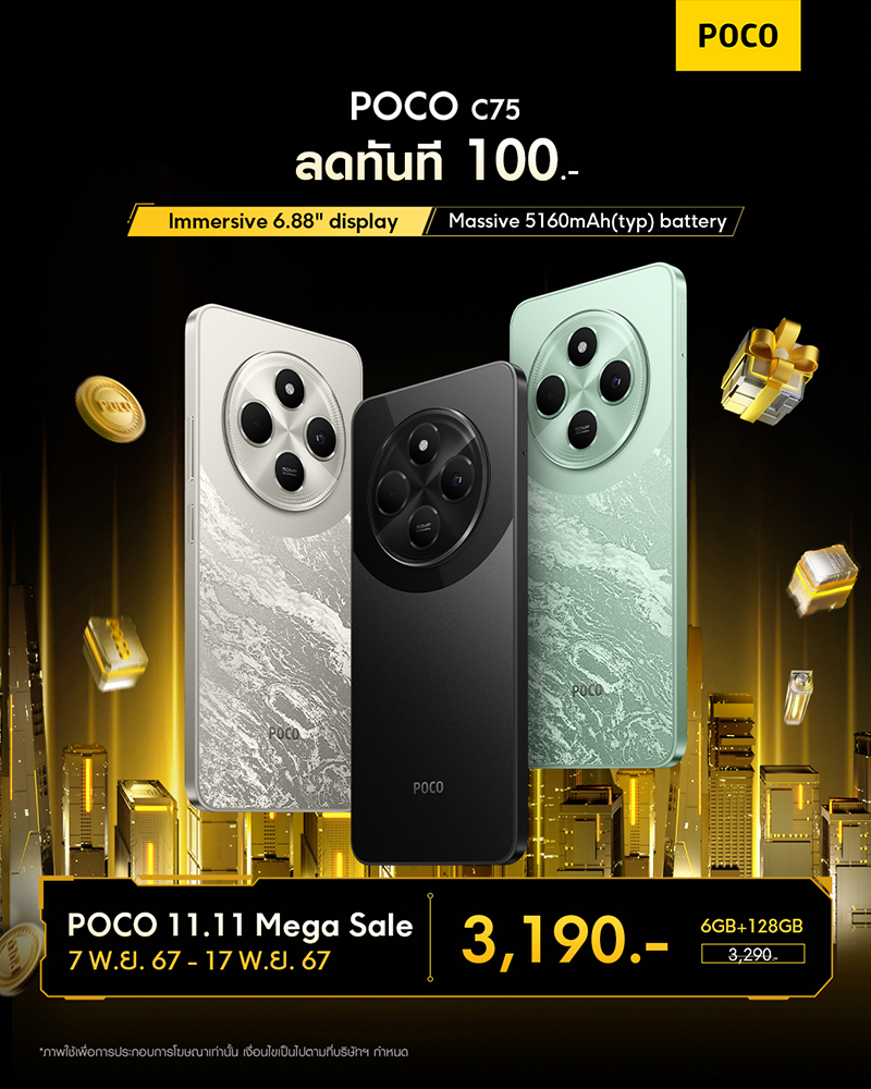 POCO ประเทศไทย ประกาศวางจำหน่าย POCO C75 สมาร์ตโฟนรุ่นใหม่ที่มาพร้อมหน้าจอขนาดใหญ่ 6.88 นิ้ว แบตเตอรี่ขนาดจุใจ 5160mAh (typ) พร้อมกล้องคู่ AI ที่มีกล้องหลักความละเอียด 50MP สมาร์ตโฟน POCO C75 วางจำหน่ายอย่างเป็นทางการในประเทศไทยแล้ววันนี้ พร้อมโปรโมชันราคาพิเศษเพื่อต้นรับการเปิดตัว เริ่มต้นที่ 3,199 บาท (จากราคาปกติ 3,299 บาท สำหรับรุ่นความจุ 6GB + 128GB) ที่ mi.com, Lazada, Shopee และ TikTok Shop นอกจากนี้ POCO ประเทศไทย ยังมอบโปรโมชั่นพิเศษสำหรับเทศกาล 11.11 โดยให้คุณเป็นเจ้าของสมาร์ตโฟนรุ่นยอดฮิตจาก POCO ในราคาสุดคุ้ม1 ตั้งแต่วันนี้ – 17 พฤศจิกายน 2567!