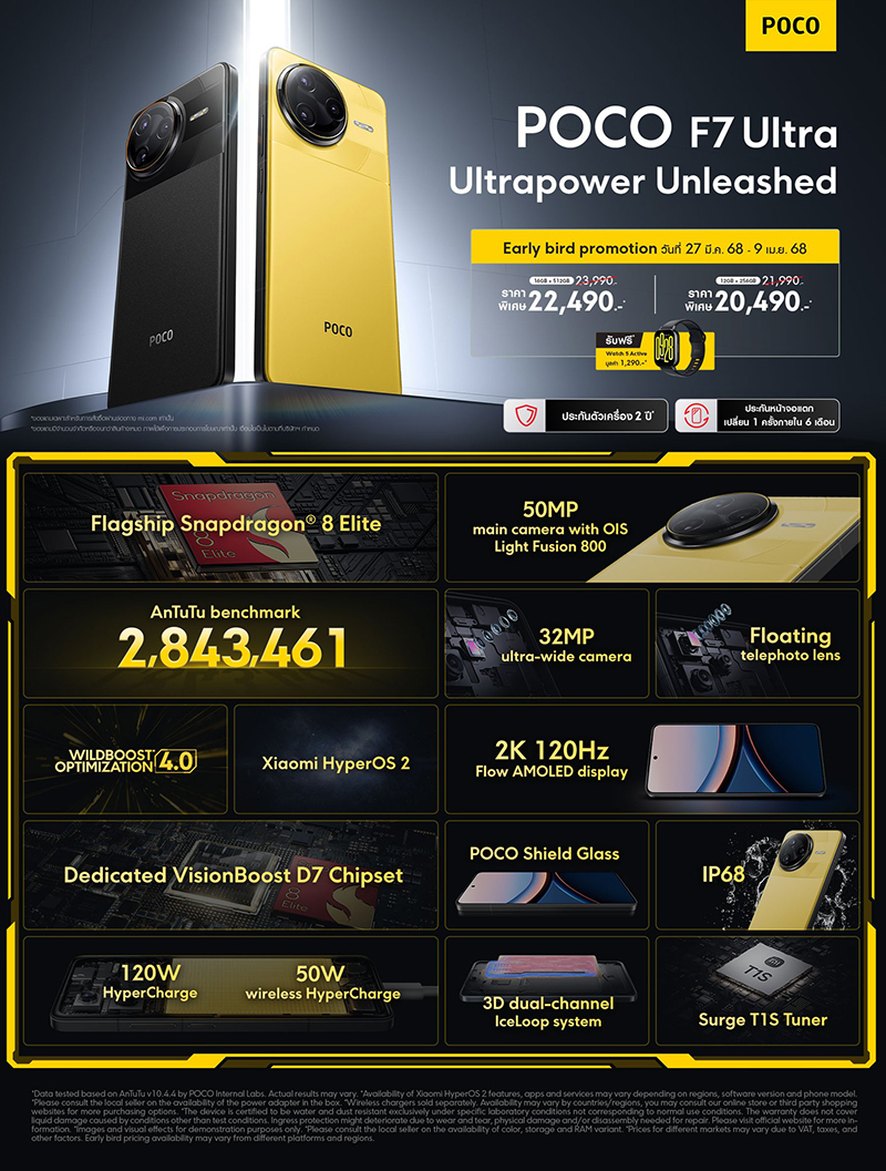 POCO เปิดตัว POCO F7 Series ซึ่งประกอบไปด้วย POCO F7 Ultra และ POCO F7 Pro สมาร์ทโฟนเรือธงรุ่นใหม่ทั้งสองรุ่นนั้นถูกออกแบบมาเพื่อความเป็นเลิศรอบด้านและขับเคลื่อนด้วยเทคโนโลยีอันล้ำสมัยที่มอบความเร็วและประสิทธิภาพสูงสุดและยังเข้าถึงผู้ใช้งานได้มากขึ้นในราคาที่เป็นมิตร ทั้งนี้ POCO Thailand ยังได้ประกาศราคาจำหน่ายและโปรโมชันพิเศษ18 สำหรับลูกค้าที่ซื้อสินค้าในระหว่างวันที่ 27 มีนาคม – 9 เมษายน 2568 โดย POCO F7 Ultra วางจำหน่ายในราคาพิเศษเริ่มต้นเพียง 20,490 บาท18 (จากราคาปกติ 21,990 บาท) และ POCO F7 Pro วางจำหน่ายในราคาพิเศษเริ่มต้นเพียง 14,490 บาท18 (จากราคาปกติ 15,990 บาท)
