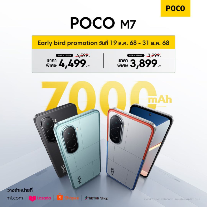 - POCO M7 รุ่นความจุ 6GB + 128GB ราคาพิเศษ 3,899 บาท15 (จากราคาปกติ 3,999 บาท)
