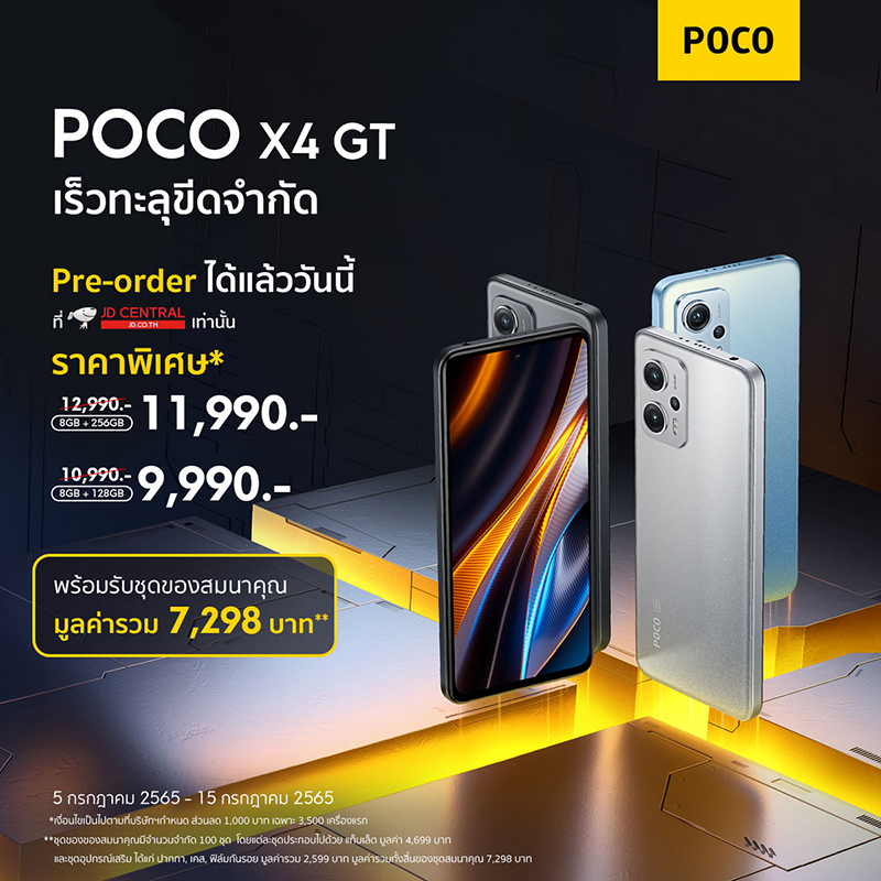 โปรโมชั่นพิเศษ! POCO X4 GT เปิดให้ลูกค้าสั่งจองล่วงหน้าในราคาพิเศษเพียง 9,990 บาท (จากราคาปกติ 10,990 บาท) สำหรับรุ่นความจุ 8GB+128GB และ 11,990 บาท (จากราคาปกติ 12,990 บาท) สำหรับรุ่นความจุ 8GB+256GB ในระหว่างวันที่ 5-15 กรกฎาคม 2565 ผ่านช่องทางจำหน่ายออนไลน์ของ JD Central เท่านั้น!2 นอกจากนี้ พิเศษสุดสำหรับลูกค้าที่สั่งจองเป็น 100 คนแรก จะได้รับชุดของสมนาคุณพิเศษ มูลค่ารวม 7,298 บาทอีกด้วย!