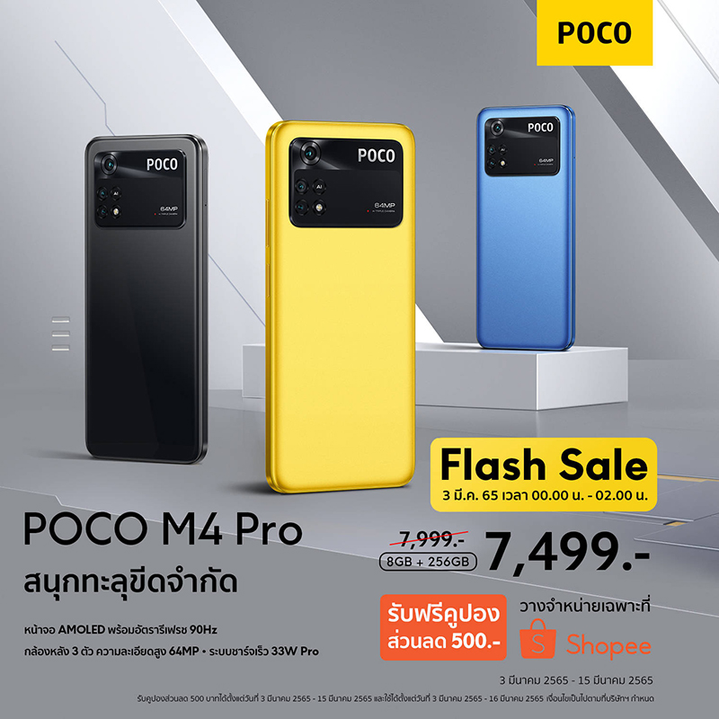 POCO M4 Pro มี 3 สีให้เลือก ได้แก่ สี Power Black สี Cool Blue และสี POCO Yellow ในขนาดความจุ 8GB+256GB โดยจะวางจำหน่ายผ่านทาง Shopee เท่านั้น โดยจัดราคาพิเศษช่วง Flash Sale เหลือเพียง 7,499 บาท ในวันที่ 3 มีนาคม 2565 ตั้งแต่เวลา 00:00 – 02:00 น. เท่านั้น (จากราคาปกติ 7,999 บาท) และสำหรับลูกค้าที่สั่งซื้อสินค้าระหว่างวันที่ 3 – 15 มีนาคม 2565 รับฟรีคูปองส่วนลดจาก Shopee มูลค่า 500 บาท