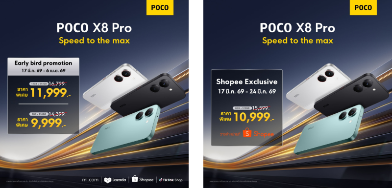 - POCO X8 Pro รุ่นความจุ 8GB + 512GB วางจำหน่ายในราคาพิเศษ 10,999 38 (จากราคาปกติ 15,599 บาท) ตั้งแต่วันนี้ – 24 มีนาคม 2569 เฉพาะที่ Shopee เท่านั้น 38