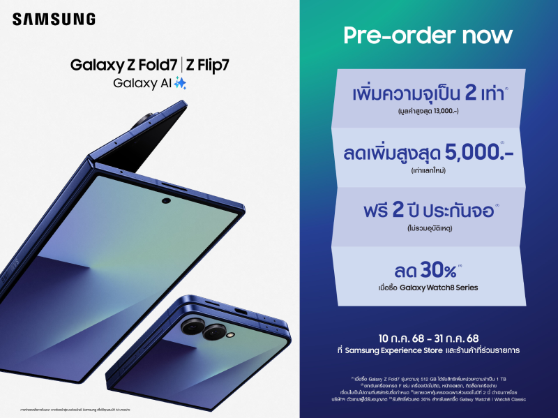 สั่งจองล่วงหน้าได้แล้ว ตั้งแต่วันนี้ – 31 ก.ค. 68 ที่ Samsung Experience Store ร้านค้าที่ร่วมรายการ และสั่งซื้อออนไลน์ทาง bit.ly/pr_buy_z-fold7-flip7 หรือดูรายละเอียดเพิ่มเติมที่ bit.ly/pr-preorder_z-fold7-flip7