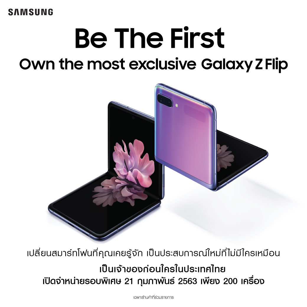 ซัมซุงเปิดจำหน่าย Galaxy Z Flip รอบพิเศษ ให้คุณเป็นเจ้าของสมาร์ทโฟนพับได้ดีไซน์สุดล้ำก่อนใครในประเทศไทย ในวันศุกร์ที่ 21 กุมภาพันธ์ 2563 จำนวนจำกัดเพียง 200 เครื่องเท่านั้น ที่ Samsung Experience Store 10 สาขา ได้แก่ สาขาเซ็นทรัลเวิลด์, สยามพารากอน, เอ็มควอเทียร์, เซ็นทรัลพลาซา ลาดพร้าว, เซ็นทรัลพลาซา ปิ่นเกล้า, เซ็นทรัลพลาซา แกรนด์ พระราม 9, เมกาบางนา, เดอะมอลล์บางกะปิ, แฟชั่นไอส์แลนด์ และ เซ็นทรัลเฟสติวัล พัทยาบีช หรือสามารถสั่งซื้อได้ทาง Samsung Online Shop และออนไลน์สโตร์ของผู้ให้บริการเครือข่าย ในราคา 44,900 บาท มาในสีม่วง Mirror Purple และสีดำ Mirror Black