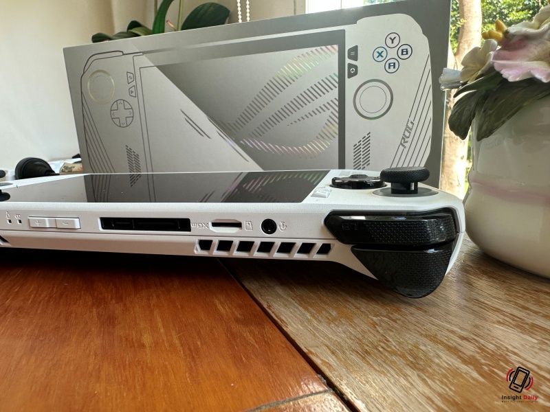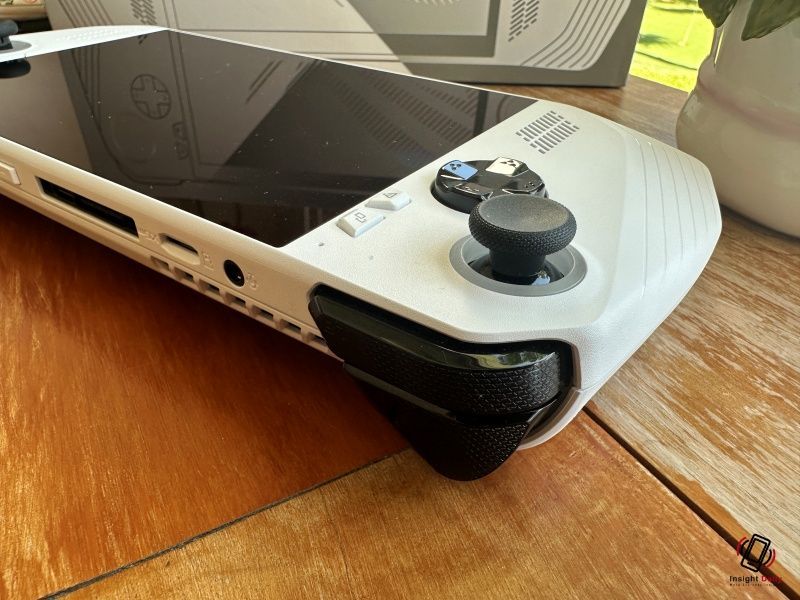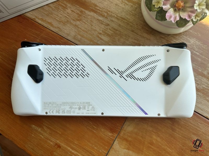 ด้านหลังตัวเครื่องจะช่องระบายอากาศเป็นโลโก้ ROG พร้อมปุ่มกด L & R Hall Effect analog triggers
