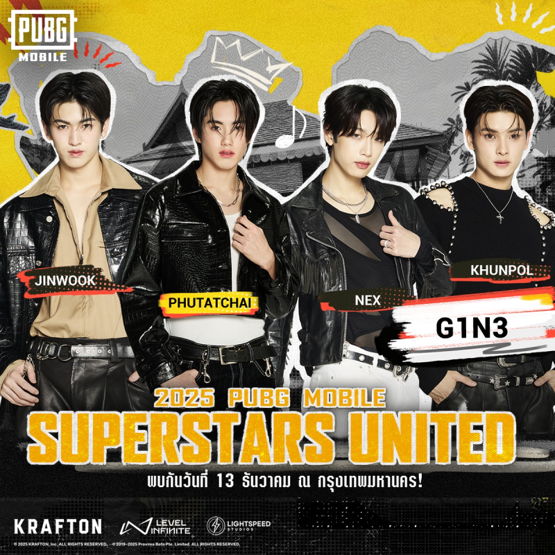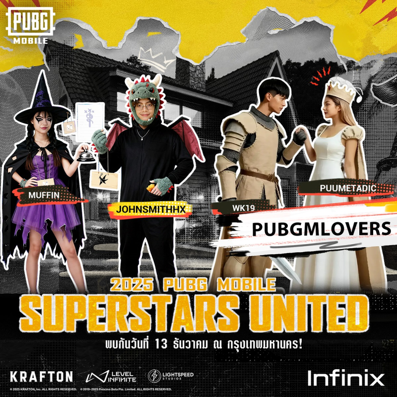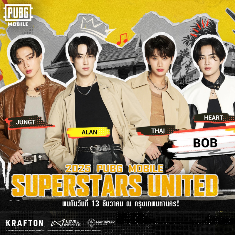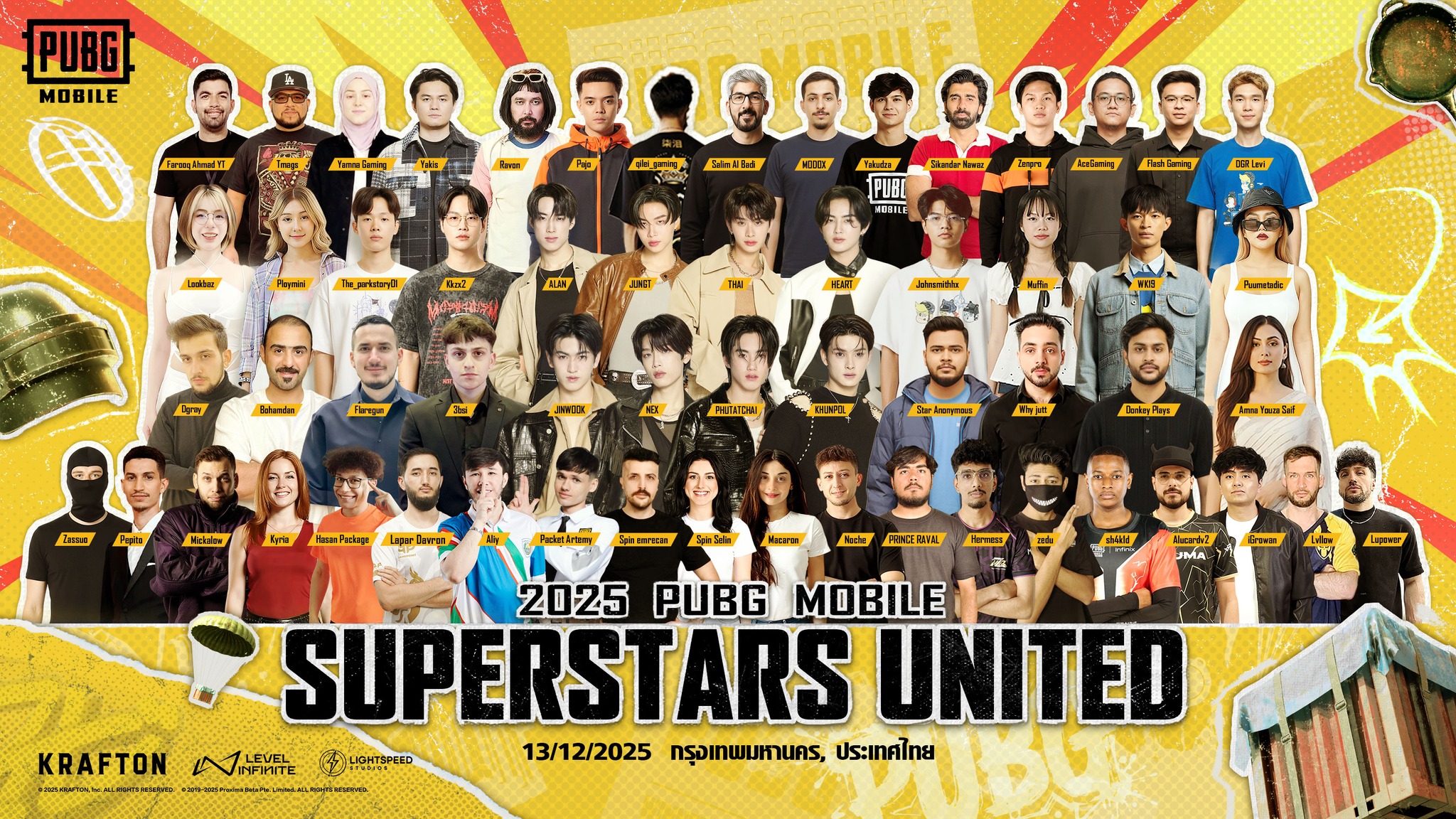 นอกจากนี้ ยังมีความตื่นเต้นสุดมันส์ในงาน 2025 PUBG MOBILE SUPERSTARS UNITED ที่จะรวบรวมทีมเซเลบริตี้และอินฟลูเอนเซอร์ชื่อดัง 16 ทีมจากทั่วทุกมุมโลก รวมถึงวงไอดอล T-POP อย่าง “BUS because of you i shine” ที่จะมาร่วมโชว์ในรูปแบบเรียลลิตี้โชว์พร้อมด้วยความดุเดือดและเซอร์ไพรซ์ตลอดการแข่งขัน แฟน ๆ ทั่วโลกสามารถติดตามความตื่นเต้นผ่านการถ่ายทอดได้ ในวันที่ 13 ธันวาคม 2568 เวลา 17.00 น. (เวลาประเทศไทย) ผ่านถ่ายทอดสดที่ช่องทางหลัก www.youtube.com/@pubgmth