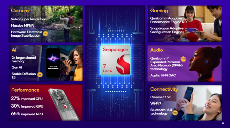 บริษัท ควอลคอมม์ เทคโนโลยีส์ อินคอร์ปอเรชั่น (Qualcomm Technologies, Inc.) เปิดตัวแพลตฟอร์มมือถือ Snapdragon® 7 Gen 4 ใหม่ล่าสุดในกลุ่ม 7-series แพลตฟอร์มใหม่ออกแบบมาเพื่อยกระดับประสบการณ์มัลติมีเดียและส่งมอบประสิทธิภาพอันทรงพลัง ไม่ว่าจะเป็นการถ่ายภาพด้วยเทคโนโลยีประมวลผลภาพขั้นสูง หรือเล่นเกมแนวแอคชั่นด้วยฟีเจอร์ Snapdragon Elite Gaming™ ผู้ใช้จะได้ดื่มด่ำกับสิ่งที่ชื่นชอบอย่างเต็มที่ Snapdragon 7 Gen 4 ยังมาพร้อม AI ล้ำสมัย รวมถึงรองรับผู้ช่วย Gen AI และโมเดลภาษาขนาดใหญ่ (LLMs) ที่ทำงานบนอุปกรณ์โดยตรง รวมถึงฟีเจอร์สร้างภาพด้วย stable diffusion ที่ไม่เคยมีมาก่อนในซีรีส์นี้