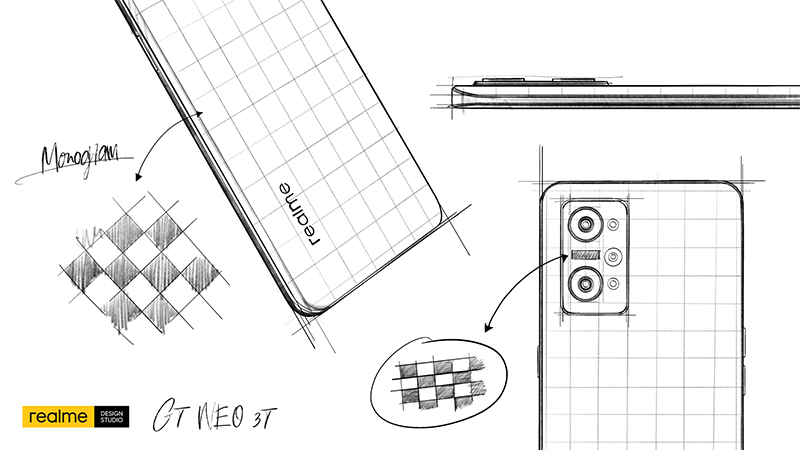 ในช่วงทศวรรษที่ 1980 ธงรถแข่งลายตารางหมากรุก หรือลวดลายแบบ Monogram ได้ถูกนำมาใช้โบกสะบัดเพื่อบอกถึงการจบการแข่งขันเมื่อมีผู้ชนะเข้าเส้นชัยได้เป็นคนแรก และผู้ชนะมักจะได้ถือธงนี้และแล่นรถไปอีกหนึ่งรอบสนามเพื่อเป็นการประกาศชัยชนะอย่างภาคภูมิใจ ด้วยเหตุนี้ realme จึงได้นำลาย Monogram มาเป็นองค์ประกอบหลักในการออกแบบสมาร์ตโฟนเรือธง realme GT NEO 3T เพื่อแสดงถึงจิตวิญญาณแห่งความเร็วและชัยชนะของ โดยนำเสนอด้วยกัน 2 โทนสี ทั้ง Dash Yellow และ Shade Black